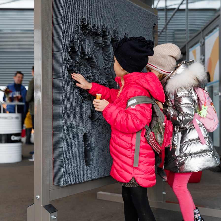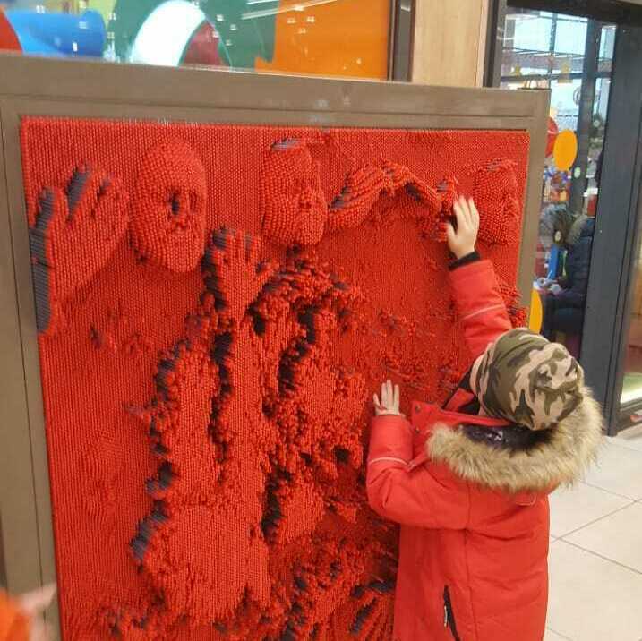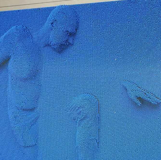 Это контактная стена с тысячами стержней (пинов). Если прижаться к ней с внутренней стороны, она повторит ваши контуры – руки, ноги, лица или любой другой части тела.